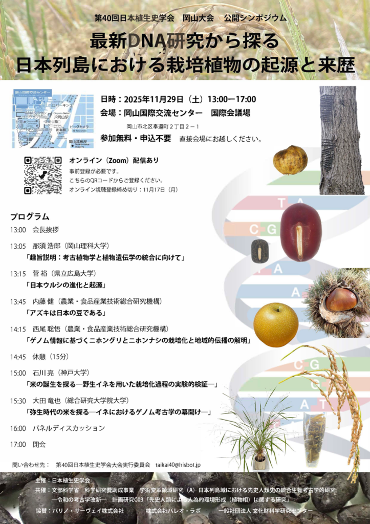 11月29日(土)に、岡山国際交流センターにて、植生史学会と本学変(A)のC03班「先史人類による人為的環境形成(植物相)に関する研究」との共催で、公開シンポジウムを開催します。